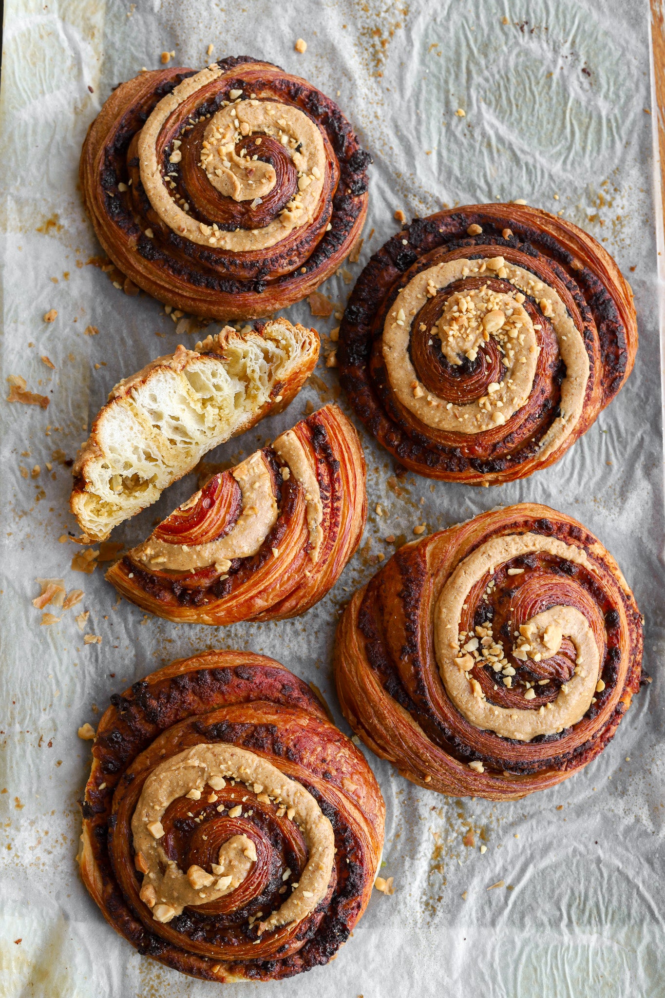 This escargot is made with a macadamian nut and almond cream, topped with a macadamian nut and dulcey chocolate spread and some macadamia  powder.